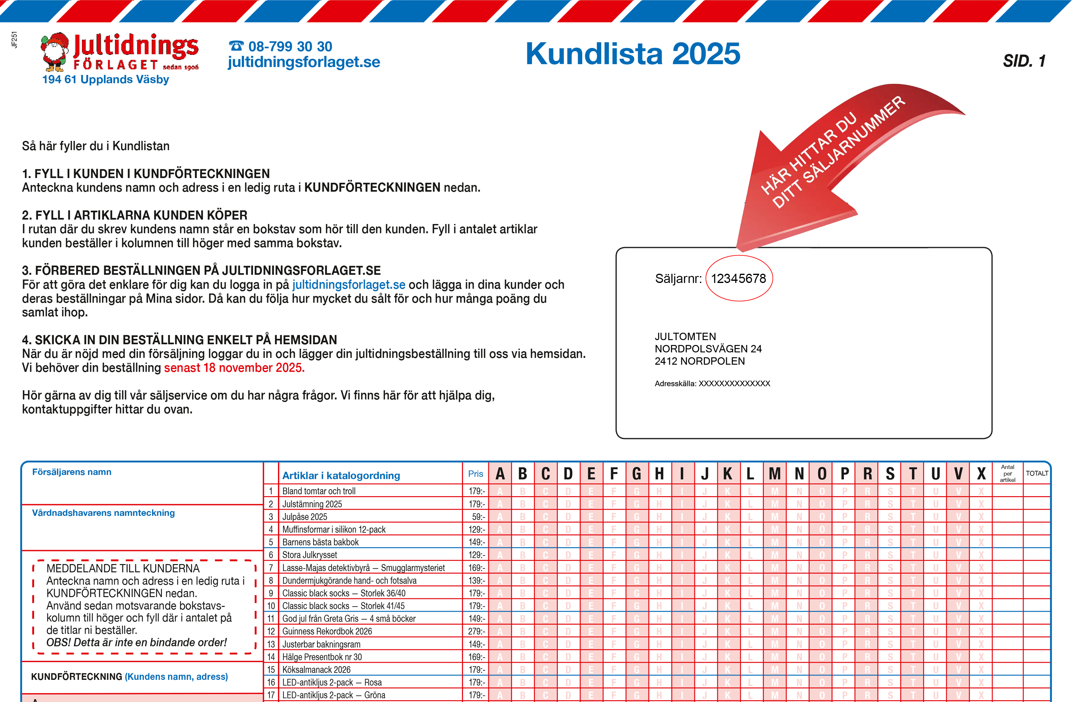 Du loggar in med hjälp av ditt säljarnummer och postnummer. Säljarnumret hittar du här på kundlistan i säljmaterialet som du fått hem.